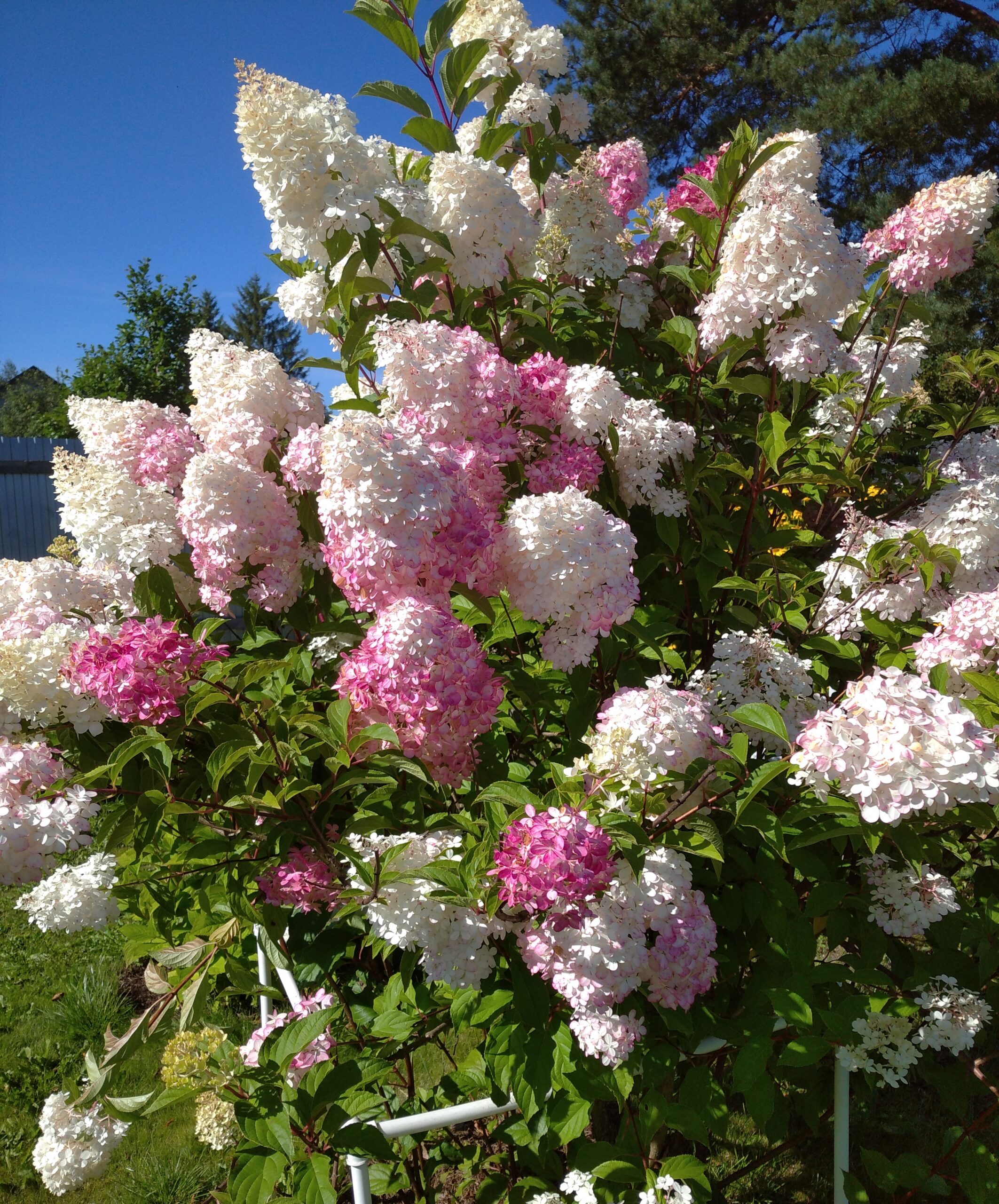 Читать далееСтремительно и мгновенно завоевал сердца садоводов-любителей и ландшафтных дизайнеров. Это один из немногих сортов, который не нуждается в рекламе. Довольно высокорослый сорт, достигает 2 и более метров в высоту, с прямостоячими, жесткими побегами. Характерной особенностью этого сорта являются побеги интенсивно окрашенные в красный цвет. Листья темно-зеленые, сидят на черешках ярко-красного цвета, что придает особую декоративность. Обладает огромными, плотными соцветиями широкопирамидальной формы, с нижними боковыми выступами. На хорошем агрофоне высота конуса иногда достигает 40-50 см. Цветы расположены по всему объему куста очень густым каскадом, сначала молочно-белые, затем нежнейшего розового оттенка, к концу цветения становятся насыщенно красными, почти вишневыми. Чувствителен к обрезке: величина соцветий сильно зависит от длины оставленных побегов.